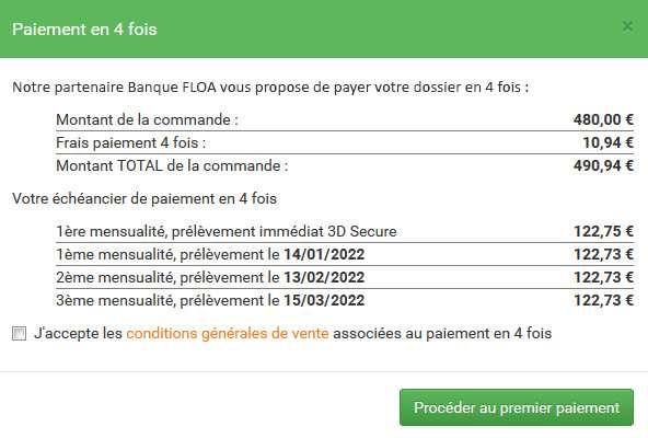 Consultez les conditions générales du paiement en 4 fois pour connaître le montant des frais retenus par FLOA.