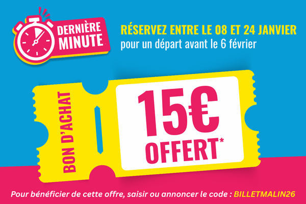 *Offre valable en agence, par téléphone ou sur internet pour toute nouvelle réservation faite entre le 08 et le 24 janvier 2026 pour un départ jusqu'au 06 février 2026. Valable sur un aller simple ou un aller retour vers toute destination. Modalités complètes de l'offre ici